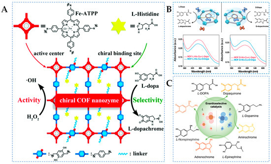 Covalent organic frameworks (COFs) are a newly emerging class of organic porous materials connected by covalent bonds, which can facilitate electron transfer and shorten the electron transfer pathway, making them excellent candidates for achieving high activity [72]. Inspired by the structure of HRP, Zhou et al. [47] synthesized chiral COFs nanozymes (D/L-His@Fe-COF) with iron porphyrin as the active center and D/L-His as the modifying unit (Figure 2A). Experimental results have shown that the stereoselectivity of COFs nanozymes originated from the chiral His unit, which can effectively mimic natural HRP. Additionally, the appropriate modification of L-His imparts specific recognition capabilities to the nanozyme, as well as enhancing its enzyme-like activity, which is 21.7 times higher than that of the natural enzyme. However, the high density of L-His enhances the selectivity factor of COFs nanozymes, and it can also hinder the catalytic oxidation of DOPA. Therefore, the catalytic activity and enantioselectivity of COFs nanozymes can be easily adjusted by changing the doped amino acids and their content. Furthermore, COFs nanozymes exhibit general enantioselectivity for POD-catalyzed chiral reactions, selectively recognizing not only DOPA but also the enantiomers of tyrosinol and Tyr. This work provides a new pathway for the development of highly active stereoselective nanozymes.