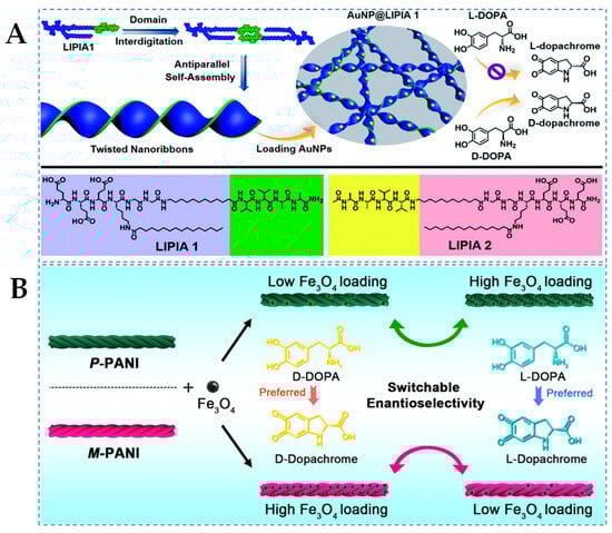 (A) Schematic illustration depicting the assembly of supramolecular nanozymes from gold-nanoparticle-decorated twisted nanoribbons and their enantioselective oxidation of D/L-DOPA [29] and (B) schematic representation of the enantioselective switchable catalysis of supramolecular chiral PANI-supported magnetic iron oxide nanozymes [41].