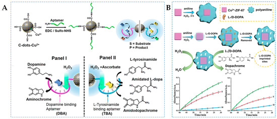 (A) Schematic representation of chemical transformations driven by aptananozymes [59] and (B) schematic representation of D/L-DOPA imprinted Co2+-ZIF-67/PAN for recognition of D/L-DOPA [60].