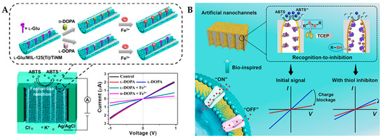 (A) Schematic representation of D/L-DOPA recognition by L-glutamine/MIL-125 (Ti) /TiNM nanozymes [98] and (B) schematic diagram of the bio-inspired sensing platform for cystine sensing based on a recognition-to-inhibition strategy [99].