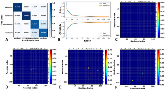 Classification and saliency map of residue contact gradients: (A) classification of K23-MDM2, 0Y7-MDM2, PDI6W-MDM2 and PDI-MDM2; (B) learning curves of the training and validation datasets; and (C–F) the saliency map of residue contact gradients for K23-MDM2, 0Y7-MDM2, PDI6W-MDM2 and PDI-MDM2.