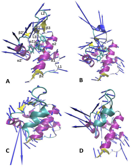 Concerted motions of MDM2 revealed by the first eigenvector via PCA: (A) K23-MDM2, (B) 0Y7-MDM2, (C) PDI6W-MDM2, and (D) PDI-MDM2.