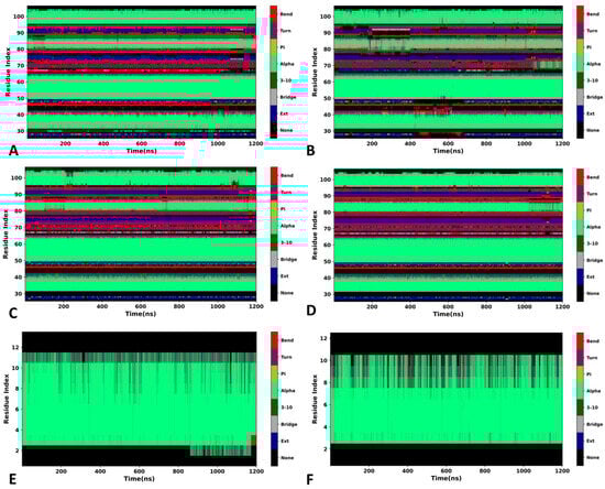 Stability of secondary structures of MDM2 and peptide inhibitors: (A) time evolution of secondary structure for MDM2 in the K23-MDM2 complex; (B) time evolution of secondary structure for MDM2 in the 0Y7-MDM2 complex; (C) time evolution of secondary structure for MDM2 in the PDI6W-MDM2 complex; (D) time evolution of secondary structure for MDM2 in the PDI-MDM2 complex; (E) time evolution of secondary structure for the peptide inhibitor PDI6W; (F) time evolution of secondary structure for the peptide inhibitor PDI.