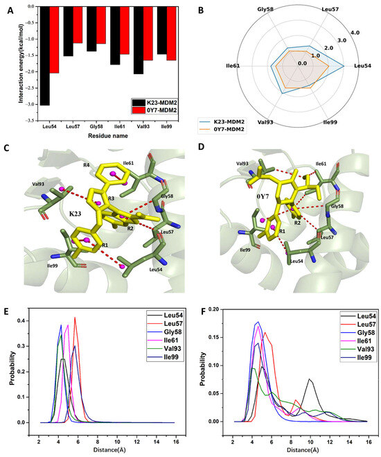 Interaction network of inhibitors K23 and 0Y7 with MDM2: (A) the key residues playing important roles in the binding of inhibitors to MDM2; (B) the radar representation of inhibitor–residue interactions in MDM2; (C) hydrophobic interactions of inhibitors with residues in the K23-MDM2 complex; (D) hydrophobic interactions of inhibitors with residues in the 0Y7-MDM2 complex; (E) the probability distribution of the distances between K23 and the key residues in MDM2; and (F) the probability distribution of the distances between 0Y7 and the key residues in MDM2.