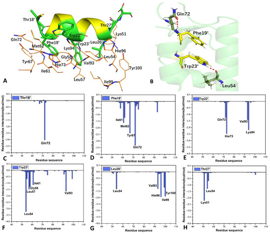 Interaction network of PDI6W inhibitor with MDM2: (A) relative geometric positions of the key residues in the pDl6W-MDM2 complex; (B) hydrogen bonding interactions in the pDl6W-MDM2 complex; and (C–H) residue–residue interaction spectrum between the pDl6W inhibitor and MDM2.