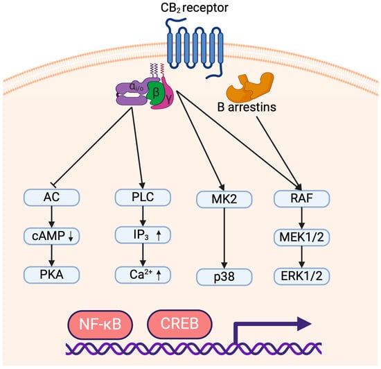 CB1 and CB2 are both G-protein-coupled receptors binding to a trimer of Gα/β/γ proteins and activate in part similar signaling cascades. CB1 can couple to either Gαs or Gαi/o proteins which respectively activate or inhibit the adenylyl cyclases. Conversely, CB2 almost exclusively recruits Gαi/o proteins leading to inhibition of adenylyl cyclase activity which reduces AMPc levels and prevents activation of PKA [39]. Since PKA activation leads to NF-κB and CREB transactivation [40], Gi/o signaling triggered by CB2 is believed to prevent the induction of inflammatory genes. Although CB2 coupling to Gαs has been reported only in rare instances, it was suggested to play an important role in the induction of a pro-inflammatory response dependent on PKA activation [41]. CB2 engagement also leads to the Gβ- and Gγ-dependent activation of p38 and ERK1/2 MAP kinases [41,42]. CB2-dependent MAPK phosphorylation was shown to be responsible for the activation of pro-inflammatory genes through transcription factors NF-κB and CREB [41,43]. Moreover, contrarily to CB1, CB2 cannot trigger potassium channel signaling through Gαs but can initiate Ca2+ signaling via phospholipase C activation by Gαi/o proteins [44]. Finally, the c-terminal tail of CB1 and CB2 can also be phosphorylated by G-Protein-Coupled Receptor Kinases (GRK), allowing the recruitment of β-arrestins. CB2 can bind β-arrestin1 and β-arrestin2 which leads to receptor internalization but also to the phosphorylation of MAPK ERK1/2 [45,46] (Figure 1).
