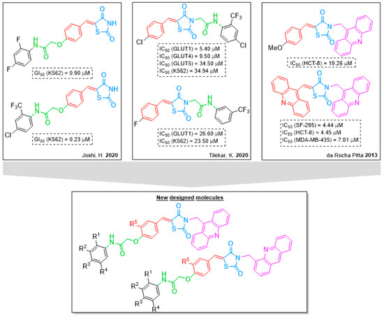 Thiazolidine-2,4-diones (Figure 1), which act as agonists of PPARγ (peroxisome proliferator-activated receptor), are well known for their ability to reduce serum glucose levels in patients with diabetes [4,5,6]. However, their clinical use has been restricted due to significant side effects and toxicity, largely attributed to the full agonistic activity at PPARγ’s binding site [7,8,9]. In addition to their metabolic effects, these PPARγ agonists have demonstrated the ability to induce apoptosis, arrest the cell cycle, and promote differentiation in various cancer cell lines. Extensive research has highlighted the antitumor potential of diverse thiazolidinone-2,4-diones across a wide range of tumor types (Figure 2) [10,11,12]. Recent studies suggest that thiazolidine-2,4-diones with a benzylidene double bond can induce apoptosis and cell cycle arrest independently of PPARγ activation [13,14]. Additionally, these compounds can inhibit glucose transporters (GLUTs), which are often upregulated in cancer cells, providing a selective mechanism to eliminate tumor cells [9,10]. The critical structural features of all these antitumor agents include aryl acetamido functionality (Ar–NH–CO–CH2) and thiazolidine-2,4-dione with a benzylidene double bond [9,10,15].