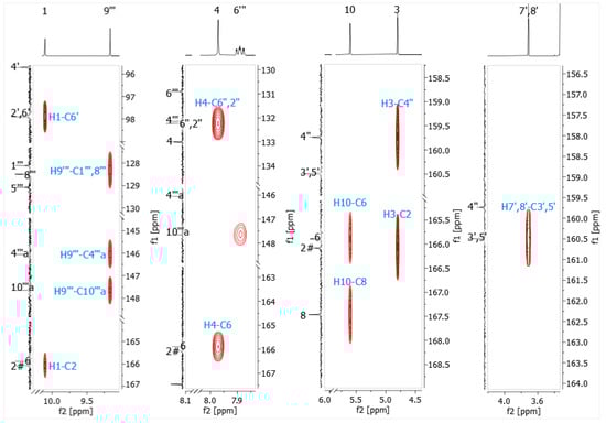 The compounds 7, 8, 12, and 13, along with their hydrochlorides 7·2HCl, 8·HCl, 12·2HCl, and 13·HCl, were studied using 1D and 2D NMR experiments to determine their structure and spectral assignments. In this discussion, we will focus on the spectrum of compound 8b. The 1H NMR spectrum of compound 8b contains six signals: two two-proton singlets at 4.80 ppm and 5.60 ppm from the methylene groups CH2-3 and CH2-10, three one-proton singlets at 10.10, 7.97, and 9.17 ppm from protons H-1, H-4, and H-9‴, and one six-proton singlet at 3.71 ppm of two equivalent methoxy groups. The proton bound to the nitrogen atom N-1 was distinguished based on the 1H,13C-HSQC spectra since there was no correlation with carbon in the spectra. The singlets of two methylene groups, i.e., CH2-3 and CH2-10, were distinguished based on HMBC spectra (Figure 3). The 4.80 ppm (CH2-3) singlet had an HMBC correlation with one carbonyl carbon at 166.1 ppm (C-2), and the 5.60 ppm (CH2-10) singlet had HMBC correlations with two carbonyl carbons at 165.9 and 167.5 ppm. To distinguish between the chemical shifts of the carbonyl carbons C-6 and C-8, as well as to differentiate between two singlets at 7.97 and 9.17 ppm from protons H-4 and H-9‴, HMBC correlation analysis was used. The HMBC correlation was observed between the proton H-4 (7.97 ppm) and the carbonyl carbon C-6 (165.9 ppm). Therefore, the singlet belonging to proton H-9‴ had a chemical shift of 9.17 ppm.