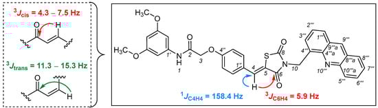 The configuration of the double bond C4=C5 of derivatives 7, 8, 12, and 13 was determined based on heteronuclear coupling constants nJCH obtained from the 1H,13C-HMBC experiment measured without the suppression of the one-bond coupling constant 1JCH and the EXSIDE experiment (Figure 5) [34]. The values of the coupling constants 1JC4H4 as well as 3JC6H4 confirm the Z-configuration of the C4=C5 bond [35,36,37,38].