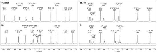 Figure 6. Comparison of 1H NMR (600 MHz, DMSO-d6) spectra of derivatives 7b/7b·2HCl and 8b/8b·HCl.