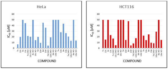 Compounds with the 4-nitrophenyl substituent demonstrated noteworthy efficacy. Compound 12d (IC50 = 9.40 ± 0.30 µM) and 7d·2HCl (IC50 = 4.55 ± 0.35 µM) showed notable activity against the HeLa cell line, and 13d (IC50 = 4.90 ± 2.90 µM) and 7d·2HCl (IC50 = 8.60 ± 2.90 µM) displayed notable activity against the HCT116 cell line (Figure 8).
