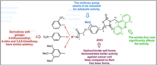 The variation in the substituent, either acridin-9-yl or acridine-4-yl, at the nitrogen atom of the thiazolidine-2,4-dione core significantly affects the activity against cancer cell lines. The acridin-9-yl substituent typically enhances the compounds’ antiproliferative activity, potentially due to its planar structure which may facilitate better intercalation with DNA or interaction with other cellular targets (Figure 9).
