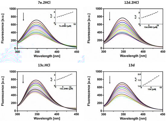 The structure of the hydrochloride derivatives 7, 8, 12, and 13 was confirmed by CHN analysis and NMR spectroscopy. CHN analysis revealed that derivatives 7 and 12 are bound to two molecules of HCl, while derivatives 8 and 13 are bound to only one molecule of HCl.