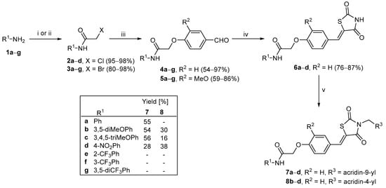 The synthetic pathways adopted to obtain the target compounds are illustrated in Scheme 1 and Scheme 2. The synthesis of the new derivatives 7 and 8 started with commercially available anilines 1ag (Scheme 1). First, anilines 1ag were transformed into 2-chloro-N-phenylacetamides 2ag using a bifunctional reagent, i.e., chloroacetyl chloride [5,31,32]. However, subsequent substitution reactions between 2-chloro-N-phenylacetamides 2ag and 4-hydroxybenzaldehyde were unsuccessful; therefore, 2-bromo-N-phenylacetamides 3ag, containing better leaving groups, were synthesized as described by Ang and coworkers [33]. The substitution reactions, which resulted in 2-(4-formylphenoxy)-N-phenylacetamides 4ag and 2-(4-formyl-2-methoxyphenoxy)-N-phenylacetamides 5ag in 54% to 87% yields, were performed in refluxing acetone in the presence of anhydrous potassium carbonate and a catalytic amount of potassium iodide [7]. The next step included Knoevenagel condensation of derivatives 4ag and 5ag with thiazolidine-2,4-dione (9) in toluene under the catalysis of piperidine and glacial acetic acid at 110 °C [5]. Although products 6ad were obtained with high purity and excellent yields (78–87%), the reactions of 4eg and 5ag with thiazolidine-2,4-dione (9) were ineffective. Then, the introduction of acridine moiety via N-substitution on the thiazolidine-2,4-dione was accomplished. The reaction of 6ad with 9-(bromomethyl)acridine was carried out in refluxing acetone in the presence of anhydrous sodium carbonate and a catalytic amount of potassium iodide to give 2-(4-{[(5Z)-3-[(acridin-9-yl)methyl]-2,4-dioxo-1,3-thiazolidin-5-ylidene]methyl}phenoxy)-N-phenylacetamides 7ad with yields ranging from 54% to 56% (Scheme 1). However, when the derivatives 6ad were similarly allowed to react with 4-(bromomethyl)acridine, the derivative 6a failed to react under these conditions, while the other derivatives, i.e., 6bd, afforded the corresponding expected products 8bd but in very low yields (16–38%, Scheme 1).