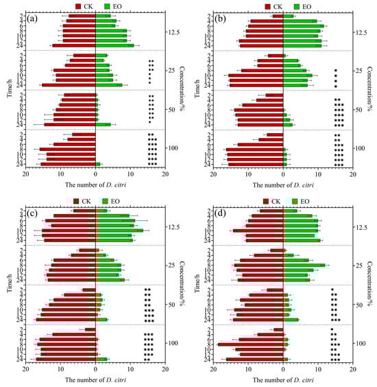 A solution of 25% acetone-aqueous solution was used to dilute EOs. The EOs were set with concentration gradients of 100%, 50%, 25%, and 12.5%. Thirty D. citri adults were placed in plastic pipes (h = 10 cm, d = 1.5 cm) under a hunger treatment for 6 h. Two healthy young shoots of M. exotica (About 5 to 7 cm) were cut and inserted into two plastic tubes filled with water; one of the shoots had evenly applied EOs and the other had applied water. The two tubes with shoots were placed at opposite corners in a net cage (60 cm × 60 cm × 60 cm). The D. citri that had completed hunger treatment were released in the center of the cage where there was an equal distance to the two tubes with shoots; each of the EOs and all its dilution gradients were tested. There were three independent replicates for each treatment. All the treated D. citri were maintained in an incubator (25 ± 2 °C, 70 ± 10% RH with a 14:10 h L:D photoperiod), and the number of D. citri on different treatment shoots was checked after being treated for 2, 4, 6, 8, 10, 12, and 24 h. The repellent efficiency was calculated using the following formula: