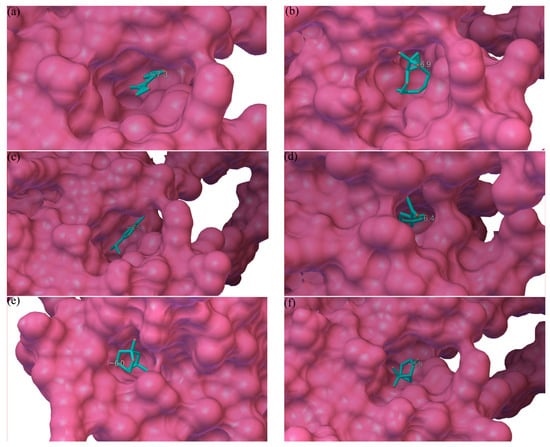 Molecular docking results of six ligands with DcitOBP7. (a) α-Pinene. (b) β-Caryophyllene. (c) α-Terpinene. (d) Limonene. (e) Eucalyptol. (f) β-Pinene.