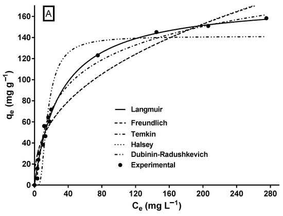 Elucidating the adsorbate biosorption isotherm, which describes and predicts the biosorption capacity as a function of the equilibrium adsorbate concentration, is crucial for designing and optimizing biosorption processes at an industrial level [43,56,62,63]. Sorption isotherms and the mathematical models that describe them can characterize the biosorption process in a complete and detailed manner [62].