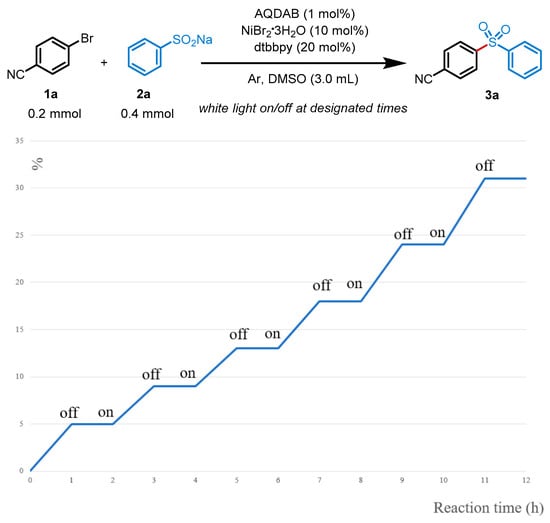 As shown in Figure 1, a series of reactions with the same substrates and catalysts was performed parallelly. The effect of on/off irradiation was explored by quenching one reaction and isolating the corresponding product at designated times. When the irradiation was turned off, the formation of the desired product stopped correspondingly. Further stirring in the absence of irradiation did not afford any more product. The reaction would proceed to accumulate product only if the light irradiation was turned on again. For example, after 1 h of stirring under irradiation, the light was turned off and 3a was isolated at a 5% yield from one reaction. A further 1 h of stirring without light irradiation (2 h’ stirring in total) led to a 5% yield of the reaction, still. Then, the light was turned on to repeat the above-described process.