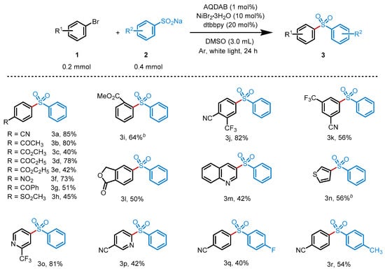 Substrate scope of sulfone compounds a. a Under standard reaction conditions: 1 (0.2 mmol, 1.0 equiv.), 2 (0.4 mmol, 2.0 equiv.), AQDAB (0.002 mmol, 1 mol%), NiBr2·3H2O (0.02 mmol, 10 mol%), dtbbpy (0.04 mmol, 20 mol%), and DMSO (3.0 mL); Kessil A160WE bulb (40 W, white light); Ar; 24 h. b Using aryl iodide as the substrate.