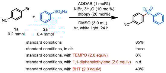 A flame-dried 25 mL quartz column reaction tube was placed with a magnetic stir bar. Then, 4-bromobenzonitrile (36.4 mg, 0.2 mmol, 1.0 equiv.), sodium benzene sulfinate (65.6 mg, 0.4 mmol, 2.0 equiv.), AQDAB (0.8 mg, 0.002 mmol, 1 mol%), NiBr2·3H2O (5.4 mg, 0.02 mmol, 10 mol%), dtbbpy (10.7 mg, 0.04 mmol, 20 mol%), and DMSO (3.0 mL) were added under Ar. The reaction tube was placed on a photocatalytic parallel reactor with a Kessil LED light source on the side. A fan was used during the irradiation to cool down the reaction tube (the temperature could reach and stay at ~40 °C). After stirring for 24 h, the crude product was concentrated and purified with column chromatography (silica gel) to obtain the target product, using PE/EtOAc as the eluent. The detail experimental information can be found in Supplementary Materials.