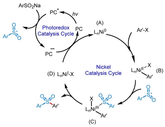 Based on our experimental findings and relevant works in the literature [24,25,26,27,28,29,30], we propose a plausible mechanism for this reaction, as shown in Scheme 5. Upon illumination, the photocatalyst (PC) is excited to form PC*, which undergoes single-electron transfer with the sodium aryl sulfinates, leading to the generation of ArSO2• and PC•−. Subsequently, oxidative addition occurs between the Ni (0) compound A and aryl bromides, resulting in the formation of the Ni (II) intermediate B. Further single-electron oxidative addition between B and ArSO2• yields complex C (NiIII). Finally, complex C undergoes a reduction elimination process, leading to the formation of the desired product and D (NiI). Compound D, along with PC•−, undergoes single-electron transfer to regenerate Ni0 and PC, thus completing both the photocatalytic and Ni-catalyzed reaction cycles.