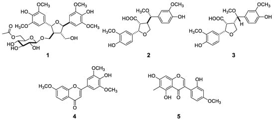 - In, S.J.; Seo, K.H.; Song, N.Y.; Lee, D.S.; Kim, Y.C.; Baek, N.I. Lignans and neolignans from the stems of Viburnum erosum and their neuroprotective and anti-inflammatory activity. Arch. Pharm. Res. 2015, 38, 26–34. [Google Scholar] [CrossRef] [PubMed]