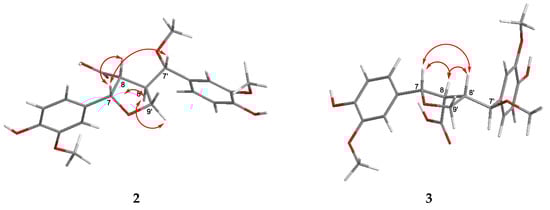 In the NOESY spectrum, the cross peaks between H-7/H-8, H-7/H-9′b, H-7/H-7′, and H-7′/H-9′b indicated the β-configuration of these protons, while the NOE correlation between H-9′a and H-8′ indicated the α-configuration of H-9′a and H-8′ (Figure 4).
