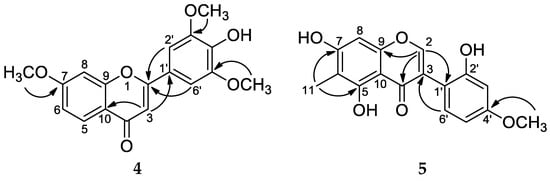 Diagnostic HMBCs (H → C) of compounds 4 and 5.