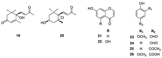 Megastigmanes are identified as phytotoxic compounds. Several compounds inhibited the germination of Lactuca sativa seeds [], e.g., 5,7-dihydroxy chromone (22) inhibited the germination of velvetleaf seeds; therefore, it has allelopathic activity []. p-Cresol (25) also possessed an allelopathic effect []. Tricin (9) has been previously isolated from other Cyperaceae species, such as Cyperus exaltatus var. iwasakii [], Rhynchospora corymbose [], and Cyperus rotundus []. Tricin (9) exerts unique biological activities over other flavonoids, such as antileishmanial [], and antihistaminic [] effects, and has a protective effect against UV-B-irradiation-caused skin damage [].