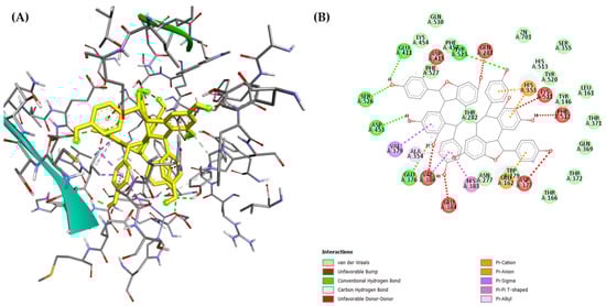 Binding of (–)-hopeaphenol (16) to the C-domain. (A): 3-D interactions of (–)-hopeaphenol (16) in yellow, with the active site amino acid residues. (B): 2-D interaction showing the type of bonding interactions, with several unfavorable interactions observed.