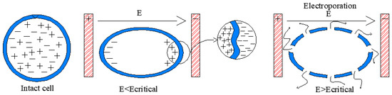 In PEFAE, short-duration pulses (in the order of ms) with high electric field strengths (0.1–10 kV/cm) are applied to food placed between two electrodes [20]. The mechanism of PEFAE is explained according to the electromechanical model: when the cells are exposed to an electric field (E), the reorganization of charges in the cell and through the membrane is induced as observed in Figure 1, increasing the transmembrane potential. The charges compress the membrane that is electrically non-conductive because of the attractive forces between charges of opposite signs, resulting in a deformation of the membrane. If the transmembrane potential exceeds a critical value, the charges on both sides of the membrane produce electrocompressive forces that can cause dielectric rupture of the membrane [21], creating new pores [12]. This rupture is named electroporation, which is the most accepted mechanism of electroplasmolysis of cells [22]. Electroplasmolysis increases electrical conductivity, diffusion, heat and mass transfer coefficients; compressibility of plant tissues; and cell membrane permeability, thereby increasing the extraction efficiency of cellular compounds [22]. The extraction speed in PEFAE depends on operating parameters such as field strength, number of pulses, pulse duration and duty cycle, and external conditions such as agitation, temperature, solid/liquid ratio, size-related effects, etc. [23].