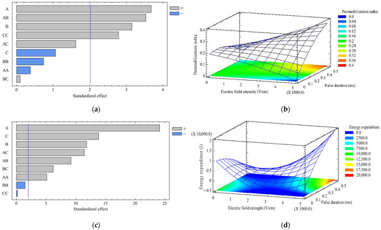 Pareto diagrams of standardized effect of electric field intensity (A); pulse duration (B); number of pulses (C); permeabilization index (a) and energy expenditure (c); and surfaces of response corresponding to the permeabilization index (b) and energy expenditure (d) depending on the electric field strength and pulse duration.