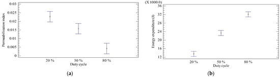 Another variable that influences the pretreatment with PEF is the duty cycle, which is the percentage of pulse duration for the period (total time between on and off) [27]. The mean diagrams of the duty cycle as a function of the permeabilization index (a) and energy expenditure (b) are shown in Figure 4. The figure shows that the cellular integrity of the treated tissue is reduced when the lowest value of the duty cycle is used, while energy expenditure increases as the duty cycle increases. Each value of the duty cycle corresponds to only one frequency and one-time interval between pulses: for 20, 50 and 80%, the frequencies and intervals of time are 400 Hz and 2 ms, 1000 Hz and 0.5 ms and 1667 Hz and 0.12 ms, respectively. Therefore, the best duty cycle found was 20%, corresponding to the lowest frequency and the highest time interval at an effective treatment time of 5 s. When considering the time interval between pulses, the results are consistent with those obtained by Lebovka et al. [34], who determined that a time interval between pulses of 60 s accelerates the permeabilization of apple tissue compared to 10−2 s for the same effective treatment time.