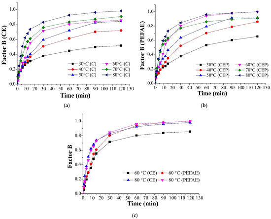 The effect of temperature on conventional extraction (CE) and extraction assisted by pulsed electric field (PEFAE) at the best pretreatment conditions found in Section 3.2 was evaluated by plotting the kinetics of inulin extraction from cabuya (factor B vs. time). The temperatures evaluated were 30, 40, 50, 60, 70 and 80 °C [24] and the best temperature was the lowest at which the maximum inulin extraction was reached, for both extraction types (Factor B equal to 1) after 2 h of extraction.