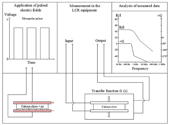 To determine the best values of the electric field intensity, number of pulses, pulse duration and duty cycle, the permeabilization index or Factor Z and the energy expenditure (relationship between the energy and normalized soluble matter content) were used as response variables. The permeabilization index was calculated with Equation (1) and the energy expenditure with Equation (4). The permeabilization index was calculated by means of the electrical conductivities and the electric resistances. The electric resistances were obtained by measuring the module and phase with LCR equipment (GW Instek, New Taipei City, Taiwan, model LCR-821) at the characteristic frequency of the Cabuya–Plates system. To do this, a pair of square bakelite electrodes, 15 mm per side, were attached to the LCR meter. Between the bakelite electrodes, cabuya slices approximately 1.5 cm in size and 2 mm thick were placed.
