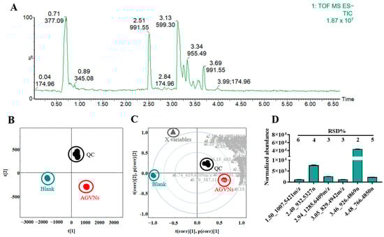 Total ion chromatogram (TIC) and multivariate statistics of the AGVNs. (A) TIC collection results for the ESI− from the AGVNs. (B) Results of the principal component analysis of the ESI− in multiple groups. (C) Multiple groups in the Loading Bi plot of the ESI−. (D) The normalized plot of the ion peak area in the QC.