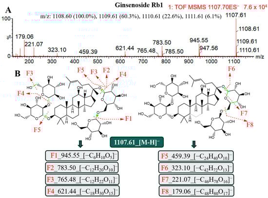 Mass spectrometry characteristics and lysis rule analysis of the ginsenoside Re under the ESI−. (A) Secondary mass spectrometry information of the ginsenoside Re. (B) Molecular structure and the possible lysis pathway of the ginsenoside Re.