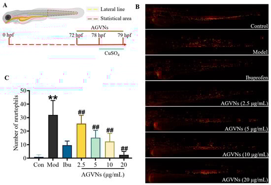 Evaluation of the effect of AGVNs on CuSO4-induced inflammatory models. (A) Schematic of model induction and AGVNs intervention. (B) Representative red-fluorescent neutrophils from different groups (bar = 200 μm). (C) Quantitative analysis of the number of neutrophils in the zebrafish inflammatory models before and after the administration of AGVNs. The red dashed quadrilateral box represents the quantitative area. Data are expressed as the mean ± SEM; ** p < 0.01 vs. the control group; ## p < 0.01 vs. the model group (CuSO4).