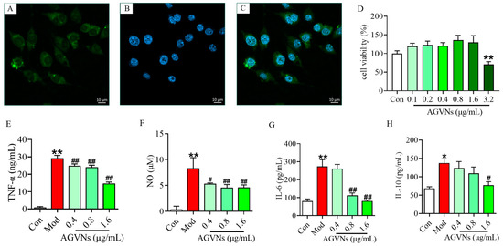 RAW264.7 cells were seeded at 1 × 105 cells/well in a dish and pretreated with AGVNs (0, 0.1, 0.2, 0.4, 0.8, 1.6 μg/mL) for 12 h. Cells were treated with 1 μg/mL LPS for 12 h [26], the cell supernatant was collected after treatment, centrifugation was performed at 10,000× g at 4 °C for 5 min, and the detection of the OD values (450 nm) of NO, IL-10, IL-6, and TNF-α was performed according to the manuals of the corresponding kits.