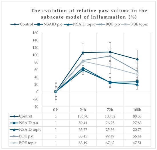Relative paw inflammation evolution in time after Freund’s adjuvant injection (calculated according to the initial paw volume). Legend: NSAID—nonsteroidal anti-inflammatory drug, BOE—Brassica oleracea extract, p.o—oral.
