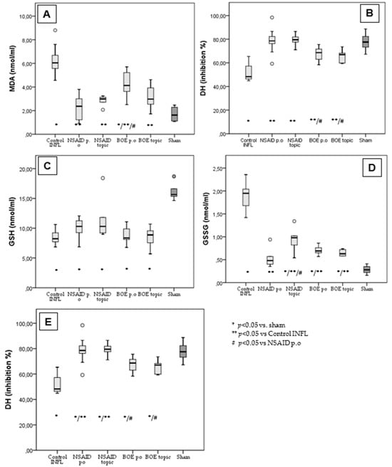 The glutathione (GSH) mean values in all groups (Control—8.37 ± 1.1 nmol/mL; NSAID p.o 9.94 ± 1.55 nmol/mL; NSAID topic 11.7 ± 3.89 nmol/mL; BOE p.o 8.88 ± 1.47 nmol/mL; BOE topic 8.54 ± 1.73 nmol/mL) are significantly reduced compared to the sham group (16.11 ± 1.42 nmol/mL) (Figure 4C).