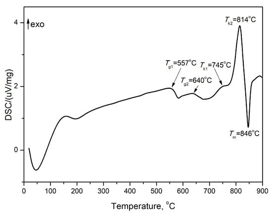 The DSC curve of the glass G-0 h is shown in Figure 1. It is seen that the DSC curve consists of two endothermic effects corresponding to the two glass transition temperatures (Tg1 and Tg2). This means that the synthesized glass consists of two amorphous phases due to the liquid phase separation. It is known that a large region of immiscibility exists in the binary system ZnO-B2O3 [6]. The maximum at the first endothermic effect (Tg1) is called hysteresis peak, formed due to enthalpy relaxation. The next two exothermic peaks are due to the crystallization of the glass (Tkn, where n = 1 and 2). The last endothermic effect corresponds to the melting temperature (Tm). The obtained glass is characterized by a high glass transition temperature. The first Tg1 value is 557 °C while the second Tg2 value is 640 °C. The crystallization temperatures are as follows: 745 and 814 °C. The melting temperature is 846 °C. On the other hand, the thermal stability of the glass, i.e., ΔT = Tk1 − Tg2, is 105 °C.