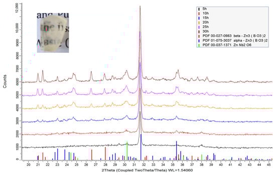 The amorphous X-ray pattern of the glass 50ZnO:47B2O3:3Nb2O5:0.5Eu2O3 (G-0 h) was presented in our previous paper [11]. The parent glass G-0 h was heat treated for different periods of time (5, 10, 15, 20, 25 and 30 h) at 610 °C in order to avoid its full crystallization. The XRD patterns at room temperature of the glass-ceramics obtained are shown in Figure 2. The photograph of the translucent glass ceramic accomplished after 25 h heating of the initial glass at 610 °C is also shown as an inset of Figure 2.