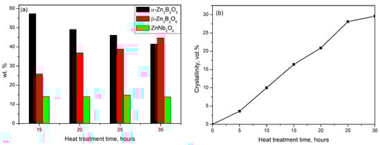 The weight percentage (wt.%) ratios of the crystalline phases formed are summarized in Figure 3a. For the GC-5 h and GC-10 h samples, it was impossible to determine the ratio between crystalline phases due to the low intensity of the diffraction lines. For sample GC-5 h, the predominated crystalline phase formed corresponds to α-Zn3B2O6 (ICDD PDF # 01-075-3037). A small amount of ZnNb2O6 (ICDD PDF # 00-037-1371) crystal phase was also detected. With increasing heat treatment time (15 h), the appearance of β-Zn3B2O6 (ICDD PDF #00-027-0983) was observed at the expense of both-α-Zn3B2O6 and the amorphous phase.