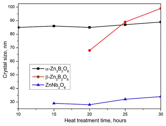 The particle sizes of β-Zn3B2O6 change from 68 to 99 nm. On the other hand, for α-Zn3B2O6 the crystal sizes do not change significantly (from 85 to 89 nm), and as well as for ZnNb2O6 (from 27 to 34 nm).