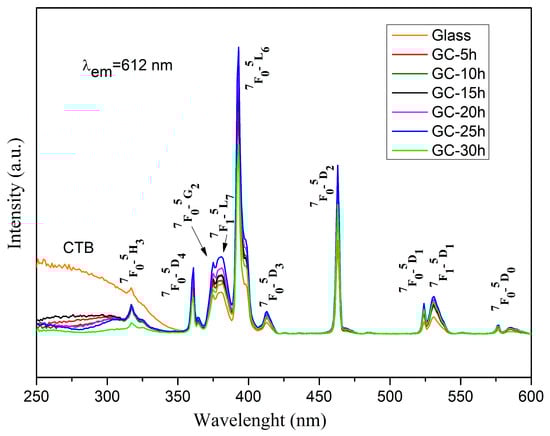 In order to study the luminescent behavior of the synthesized glass and glass-ceramics, the emission (λex = 392 nm) and excitation (λem = 612 nm) spectra of the obtained samples were measured. Figure 7 displays the room temperature PLE spectra of 0.5 mol% Eu3+ -doped 50ZnO:47B2O3:3Nb2O5 glass and glass-ceramics, recorded at 612 nm emission, corresponding to 5D0→7F2 transition of Eu3+ ions.