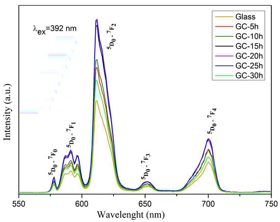 The intensity of the f-f peaks increases with the time of heat treatment up to 25 h and then decreases at 30 h. The same trend is observed in the emission spectra. This behavior is most likely caused by the change in active ion surroundings after glass crystallization and hence more efficient excitation of Eu3+ can be expected in the glass-ceramic samples [31]. The most intensive peak of the excitation spectra is located at 392 nm attributed to 7F0 → 5L6, followed by the 7F0 → 5D2 at 463 nm. These wavelengths can be used as an excitation source to register the emission spectra and are compatible with the commercially available near ultraviolet light-emitting diodes (LEDs) (250–400 nm) and blue LED chips (430–470 nm).