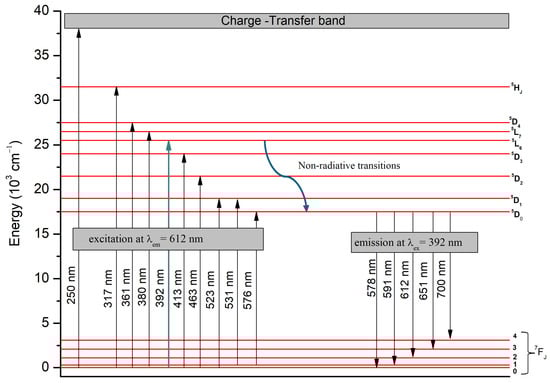 The excitation and emission transitions of Eu3+ ions are illustrated in the schematic energy-level diagram in Figure 9.