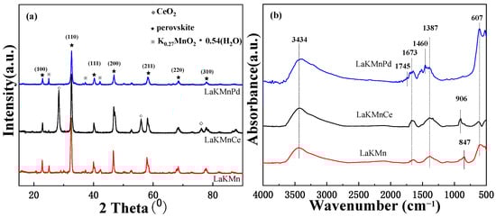 (a) X-ray diffraction patterns for catalysts; (b) FT-IR of LaKMnO3, LaKMnCeO3, and LaKMnPdO3 catalysts.