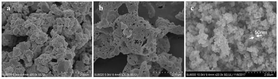 In the catalytic reaction involving gas–solid contact, the surface structure of the catalyst plays a significant role in catalytic activity. In order to further analyze the influences of the structure of a catalyst surface on the catalytic activity, as shown in Figure 2, SEM observations at the magnification of ×20,000 were performed on the three catalysts, including LaKMnO3, LaKMnCeO3, and LaKMnPdO3. It is apparent that the LaKMnO3 particles are irregular in size and poorly dispersed, whereas the catalyst particles doped with Ce or Pd exhibit more uniform dispersion and a spherical shape with the particle size range of 50–100 nm, and they are arranged more loosely. This is consistent with the results in Table 1.
